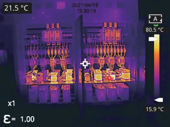Most faults in power devices are accompanied by abnormal heating, which directly affects system stability and reduces the service life of components. A thermal camera can be used to monitor the real-time operating status of electrical devices. The measured temperature can be compared with historical data or with the temperature of similar devices in the same environment to determine whether there is a temperature rise.