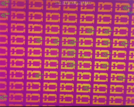 During the production process of LED chips, there will be insufficient curing of silver glue, contamination of brackets or chip electrodes, resulting in large contact resistance or unstable contact resistance, and other adverse phenomena like temperature rise. Compared with traditional monitoring solutions, thermal cameras provide a more obvious and direct monitoring result, displaying more objectively defect locations of LED chips. In this project, our thermal camera TN460 is deployed above the LED chip to monitor the temperature in the core area in real time. With our professional temperature analysis software “TI studio”, it can clearly identify chip defects.